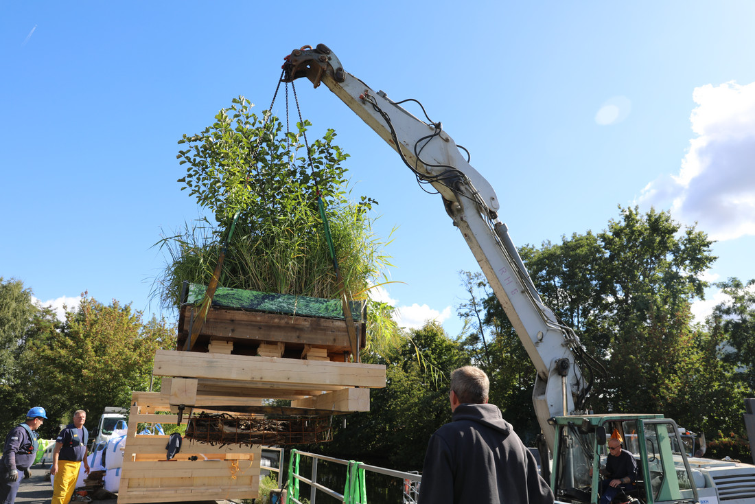 Unter den Augen interessierter Berliner*innen, Journalist*innen, Vertreter*innen des Bezirksamtes Spandau und des Staatssekretärs für Klimaschutz und Umwelt Andreas Kraus wurden die je vier Tonnen schweren Inseln an einem sonnigen Herbsttag zu Wasser gelassen. Die Stiftung Naturschutz Berlin fördert dieses vielversprechende Projekt aus Stiftungsmitteln.