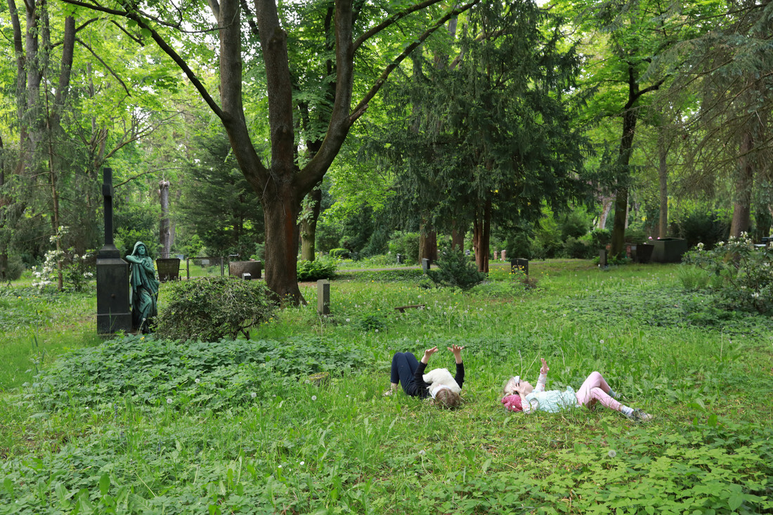 Dann haben wir etwas Zeit, allein den Vögeln zu lauschen: Dabei suchen wir uns einen ruhigen Ort zum Hinsetzen oder Hinlegen. Wer möchte, kann dabei eine Augenbinde tragen, denn so verstärkt und fokussiert sich das Gehör. Amseln zwitschern, Tauben gurren, ein leichter Wind bringt die Wipfel der hohen Bäume zum Rauschen. Die Stille auf dem Friedhof ist gar nicht so still! Wie klingen die Gesänge? Welche Laute finden wir besonders auffällig? Können wir sie imitieren?
