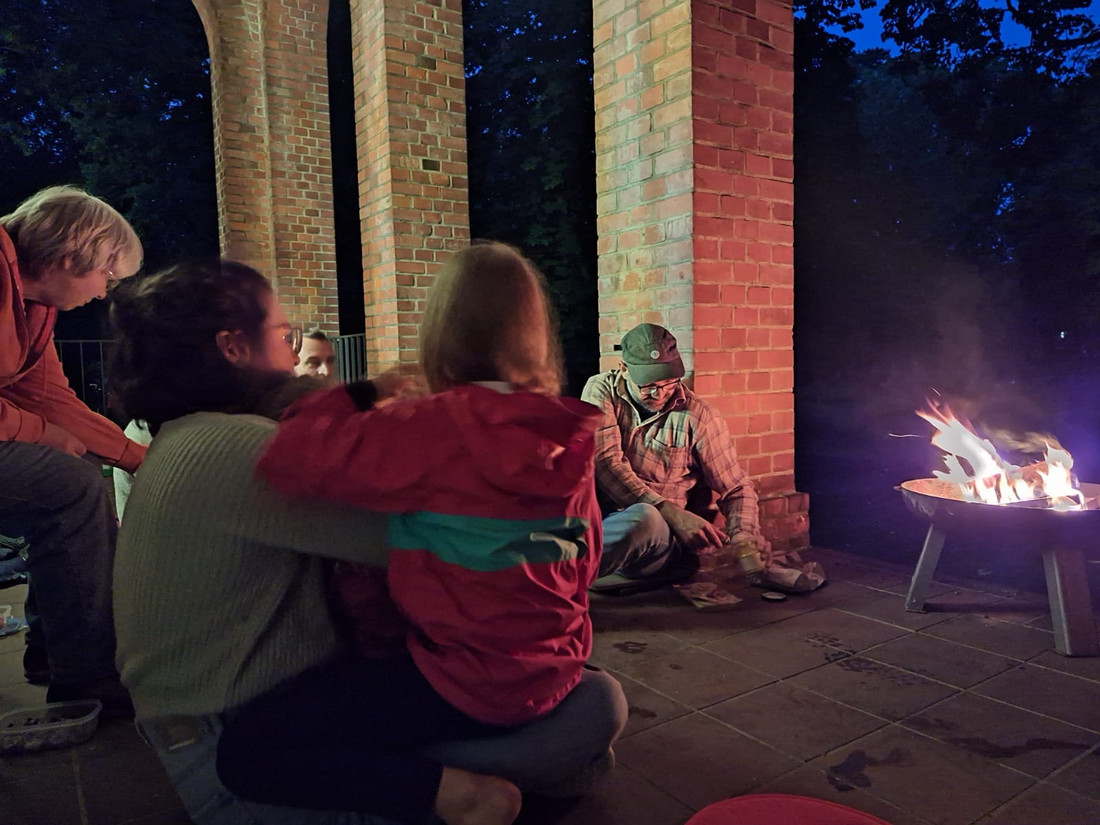 Beim Wandern über den Friedhof hören und sehen wir vor allem Amseln, die sich in der Dämmerung lautstark verständigen. Eike spricht von einem „Amselteppich, der sich über alles legt“. In der Ferne donnert es jetzt, Regentropfen fallen. Wir haben unseren Rundgang rechtzeitig beendet, bevor ein ausgiebiger Regenschauer losbricht. Mit der Übernachtung auf der Wiese wird es heute wohl nichts! Also breiten wir uns auf der überdachten Veranda der Kapelle aus. Eike und Micha bringen eine Feuerschale heran, wir packen unseren Proviant aus und unterhalten uns.