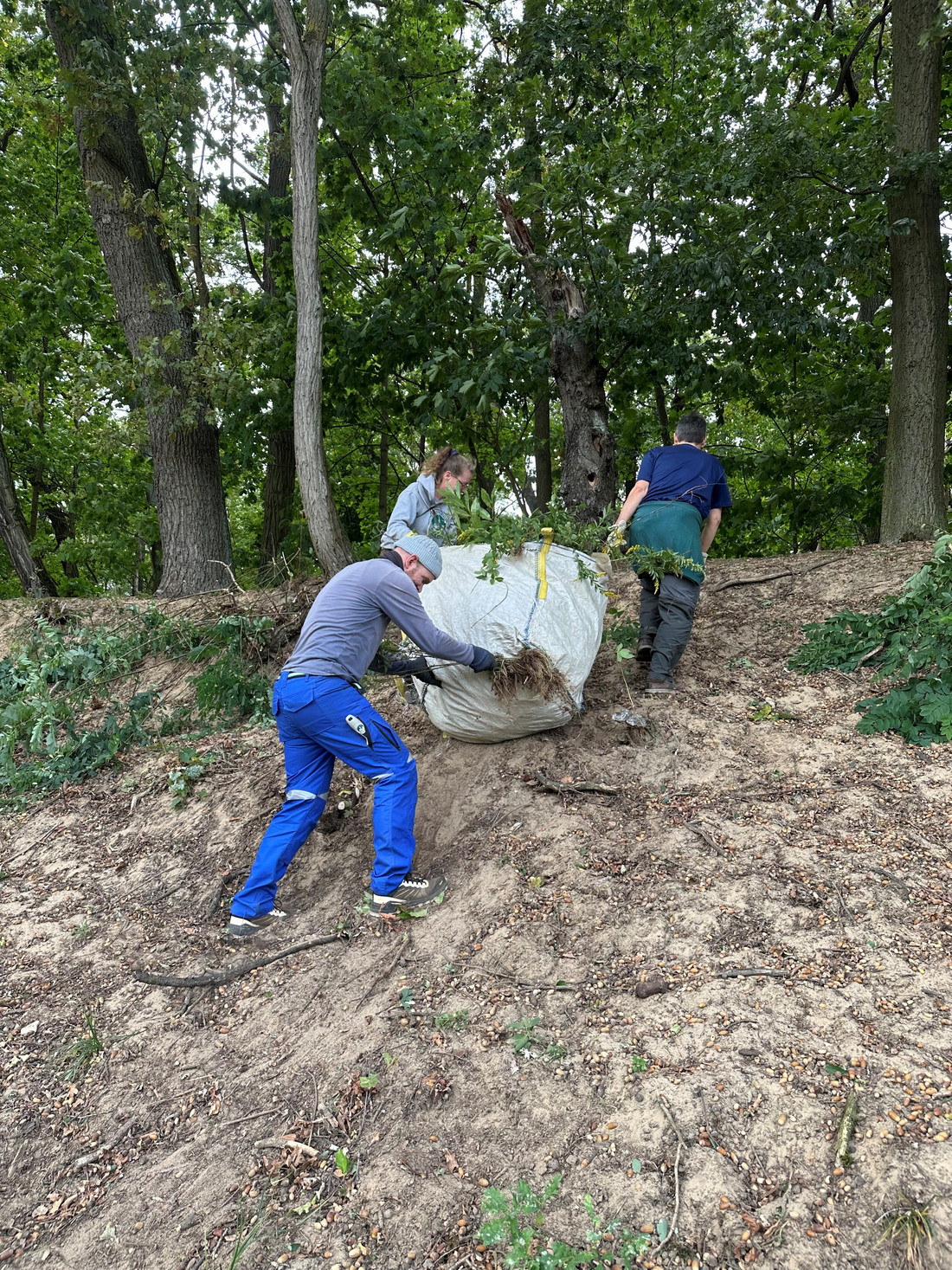 Mit Spaten, Hacke, Säge und jeder Menge guter Laune ging es den gebietsfremden Pflanzen an den Kragen. Mit dabei waren Teams der Berliner Volksbank, von Hogan Lovells, der Stephanus-Werkstätten und vom NABU Charlottenburg-Wilmersdorf. Unterstützt wurden sie von den Stadtnatur-Ranger*innen und dem Team Nemo der Stiftung Naturschutz Berlin – und gemeinsam haben sie in kurzer Zeit Erstaunliches geschafft. Wo vorher dichte Sträucher standen, haben sie Licht, Luft und Platz für die kleinen, lichtliebenden Spezialisten des Sandtrockenrasens geschaffen.