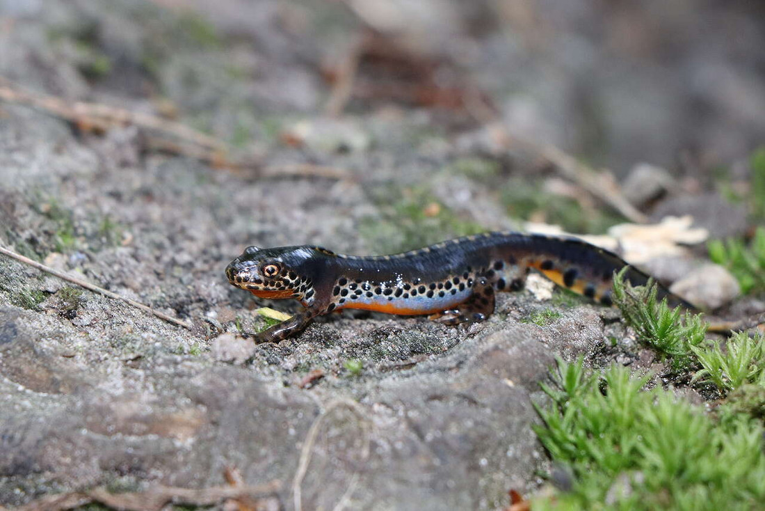 Im Nordosten Deutschlands ist der Bergmolch üblicherweise nicht anzutreffen. Mit einer Ausnahme: Berlin. Das ursprünglich in strukturreichen Wäldern beheimatete Amphib wurde vermutlich durch Menschenhand in der Berliner Stadtnatur ausgesetzt. Da der Bergmolch recht genügsam ist und es ihm in unserer Stadt scheinbar gut gefällt, breitet er sich zunehmend aus. Seine Bauchunterseite ist gelborange bis rot gefärbt, Männchen haben eine hell-dunkel-gestreifte Rückenleiste und blaue Streifen an der Bauchseite mit schwarz-weißen Flecken darüber. Die Weibchen schillern oft durch eine dunkelviolette Marmorierung.