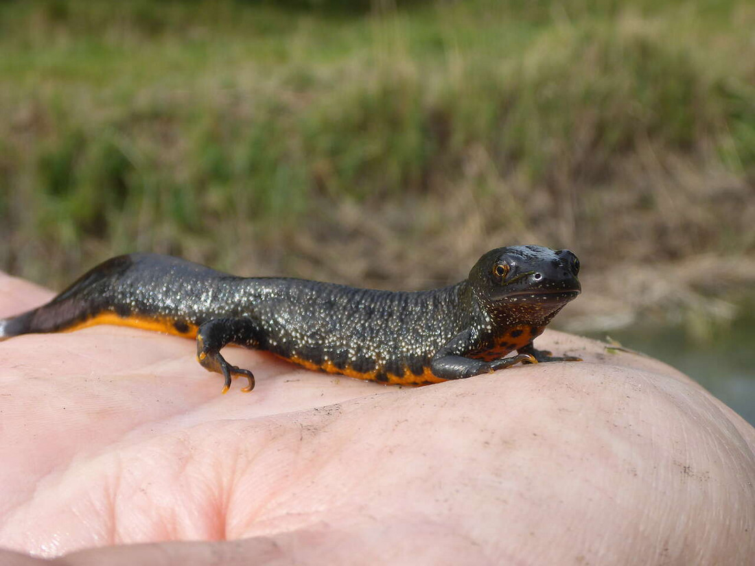 Kammmolche sind unsere größte Molchart und wirken schon auf den ersten Blick kräftiger und größer als Teichmolche. Typisch für den Kammmolch ist seine gelbe bis orangegelbe Bauchunterseite mit schwarzen Flecken. Er ist anspruchsvoller als der Teichmolch, die Zerstörung und Austrocknung von Kleingewässern setzen ihm sehr zu. Er ist daher europaweit geschützt, nach Bundesnaturschutzgesetz sogar „streng geschützt“.