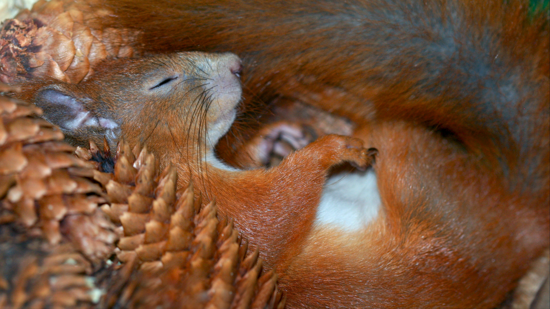 Eichhörnchen halten keinen Winterschlaf, sondern eine Winterruhe. Sie schlafen viel, wachen aber regelmäßig auf, um von ihren Vorräten zu fressen. Schon im Spätsommer legen sie Nüsse, Zapfen und Samen in unzähligen kleinen Verstecken an.