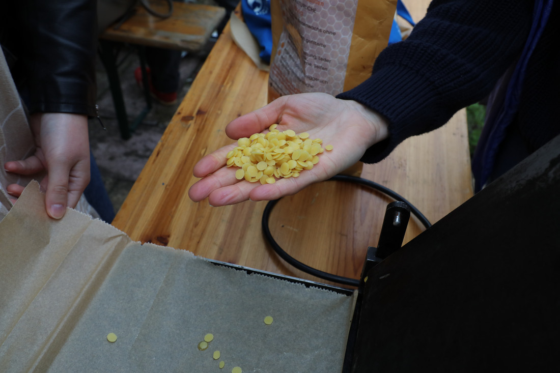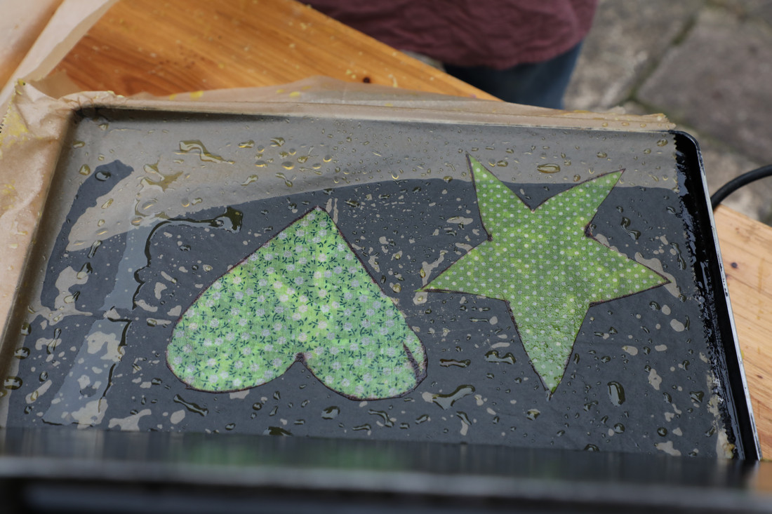 Volodimir zeigt uns, wie es geht: Zuerst wird der Stoffrest auf die gewünschte Größe und Form für die Verpackung zugeschnitten. Dann werden einige Perlen Bienenwachs bei niedriger Temperatur auf der Grillplatte mit Backpapier geschmolzen. Der Stoffrest wird auf die Grillplatte gelegt und mit weiteren Wachsperlen darüber imprägniert. Eine weitere Schicht Backpapier wird aufgetragen und mit dem oberen Grill erhitzt. Wenn man keinen Grill hat, kann dieser Prozess auch mit einem Blech und einem Bügeleisen durchgeführt werden. Schließlich wird das Bienenwachstuch von der Grillplatte entfernt und an der Luft getrocknet.