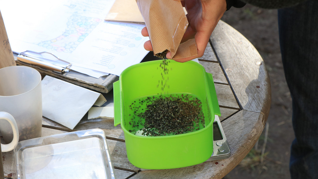 Wildpflanzen benötigen Platz und viele Wildpflanzensamen sind sehr klein und leicht. Unsere Saatgutmischungen werden daher weitaus sparsamer verwendet als etwa herkömmliche Rasensamen. Verwenden Sie 2 g Saatgut je m². Zur Erleichterung der Ausbringung sollten Sie die Samen mit trockenem, feinkrümeligem Substrat wie Sand oder dem vorliegenden Boden mischen. So können die teils sehr kleinen Samen gleichmäßig ausgesät werden.