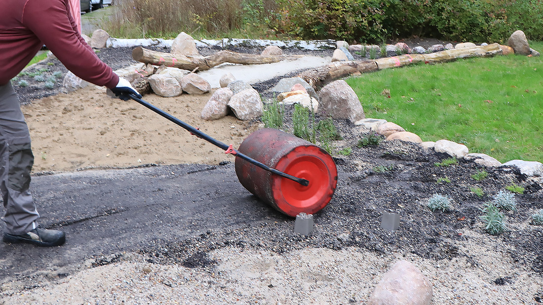 Bringen Sie das Saatgut breitwürfig von Hand aus, die Hälfte längs und die Hälfte quer über die Fläche. Drücken Sie das Saatgut danach an den Boden an, idealerweise mit einer Walze. Falls keine Walze verfügbar ist, können Sie sich mit Füßen, Schaufelrücken oder Holzbrettern behelfen. Ein guter, gleichmäßiger Bodenkontakt der Samen ist wichtig für den Ansaaterfolg. Arbeiten Sie die Samen nicht in den Boden ein.