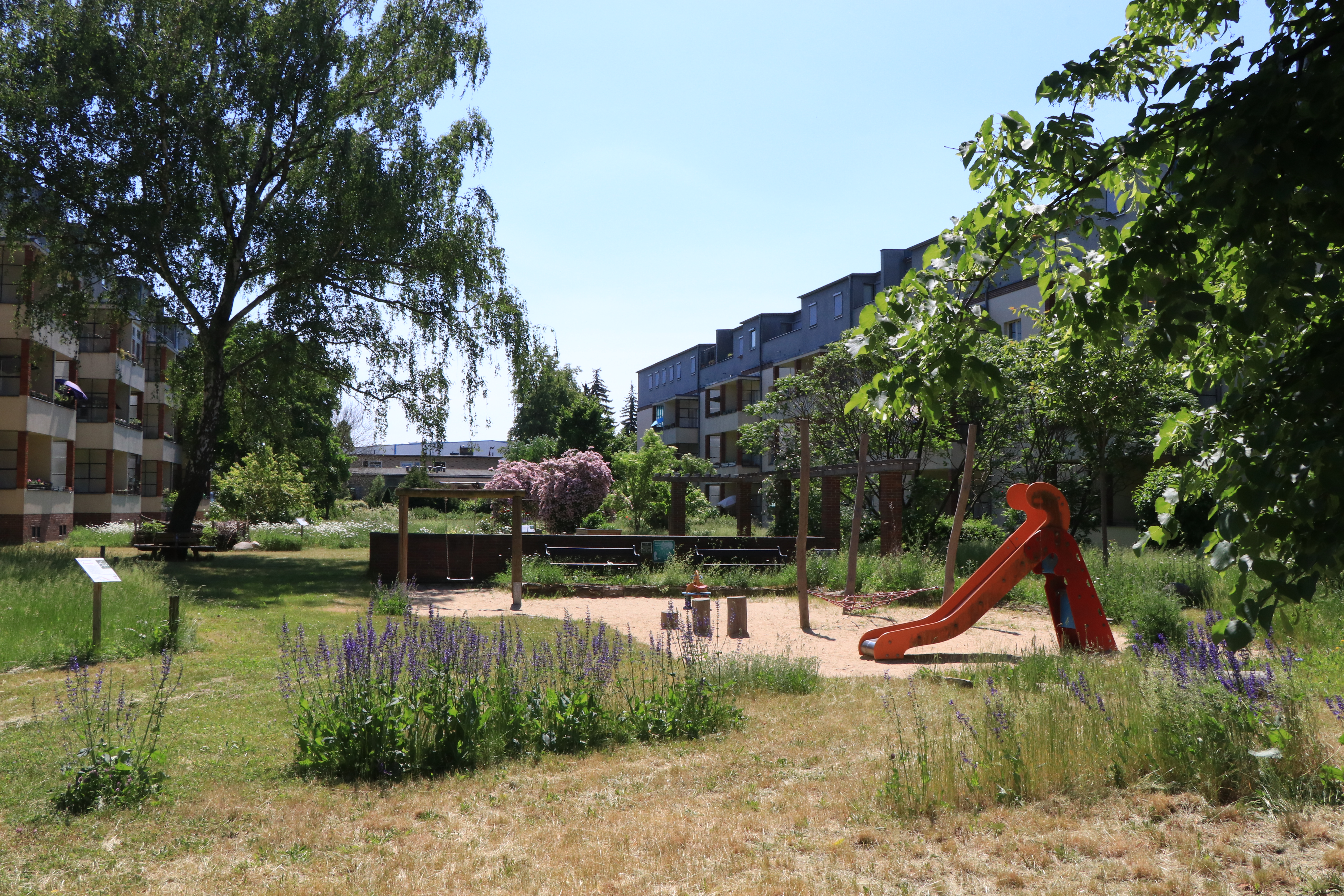 Unter großer Beteiligung der Anwohner*innen wurde von der Stiftung Naturschutz und der Wohnungsgenossenschaft ein Maßnahmenplan entwickelt, der bereits in den ersten vier von insgesamt fünf Höfen umgesetzt wurde. Zunächst wurde die gärtnerische Standardpflege, wie Kastenschnitt von Hecken und große Flächen von kurzgeschorenem Rasen, über Bord geworfen. Gehölze, Saumbereiche und Wiesen dürfen jetzt wachsen. Ergänzend wurden einheimische Gehölze, Frühjahrsblüher und ortstypische heimische Wildpflanzen gepflanzt bzw. ausgesät. Stein- und Asthaufen, sandige Trockeninseln und Nistmöglichkeiten bieten nun Tieren Unterschlupf. Auch die Lebensqualität der Bewohner*innen ist gestiegen. Für die Kinder gibt es naturnahe Spielangebote wie Baumstämme und Spielgebüsche. Obstgehölze und Hochbeete können von Mieterinnen und Mietern in Patenschaft übernommen und beerntet werden.